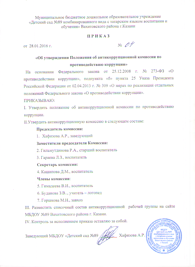 ПРИКАЗ "Об утверждении Положения об антикоррупционной комиссии по противодействию коррупции"