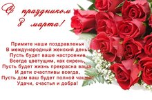 Поздравляем прекрасных дам с днем 8 Марта! Пожелаем им волшебных дней, изумительного настроения и обаятельной женственности! Пусть в ваших семьях царит частичка добра, благополучия, достатка и уюта. Сияния души вам и аромата свежих роз.