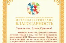 Уважаемая Елена Юрьевна! Выражаю Вам благодарность за большой личный вклад в подготовку и успешное проведение VIII Международных Открытых Алишевских педагогических чтений «Современное дополнительное образование детей: сочетание традиций и инноваций . К 100- летию государственной системы (внешкольного) дополнительного образования детей». Благодаря Вашему профессионализму и компетентности Алишевские чтения являются инновационной площадкой по формированию современного педагогического мышления и обмену опытом воспитательной деятельности учреждений общего и дополнительного образования в рамках Всероссийского педагогического Фестиваля «Берега детства».