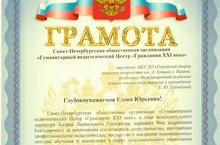 Грамота от Санкт-Петербургской общественной организации "Гуманитарный педагогический Центр "Гражданин XXI века 21.02.2018 Глубокоуважаемая Елена Юрьевна! Санкт-Петербургская общественная организация «Гуманитарный педагогический Центр «Гражданин ХХI века», в лице исполнительного директора Андрея Леонидовича Третьякова, выражает Вам искреннюю благодарность за многолетнее плодотворное сотрудничество, высочайшее профессиональное педагогическое мастерство и внедрение инновационных методик обучения и воспитания в сфере` дополнительного образования детей. Дополнительное образование детей как процесс целенаправленной трансляции историко-культурного наследия, накопленного поколениями людей, является важнейшим фактором развития общества и цивилизации. Искренне надеемся на сотрудничество!