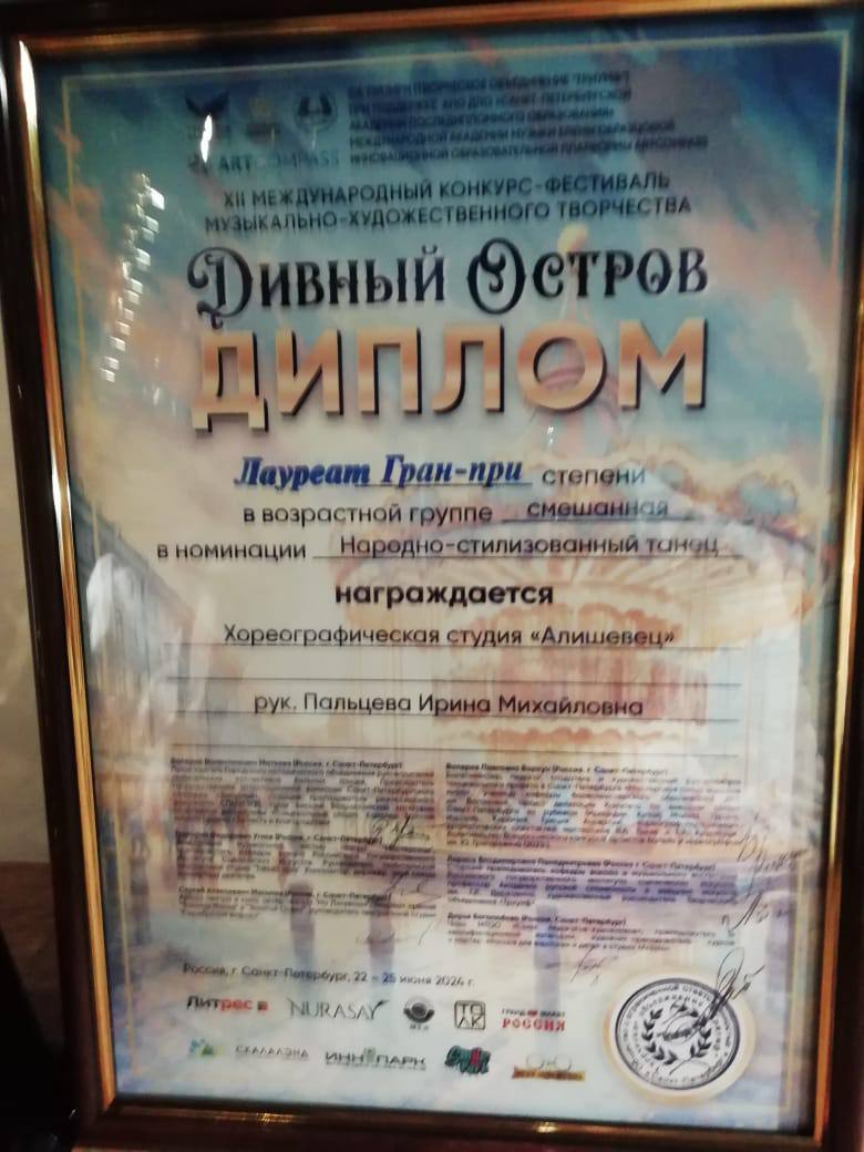Опубликовано: 25.06.2024Хореографическая студия «Алишевец» ГДДТ им. А. Алиша пед. И.М. Пальцева стали обладателем Гран-при на Международном конкурсе-фестивале «Дивный остров» в городе Санкт-Петербург.