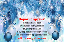Дорогие друзья! Приглашаем всех учащихся объединений 25 декабря в 11.00 в Центр детского творчества на новогоднее представление "В гостях у ёлочки"