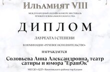 Состоялся VIII международный онлайн конкурс-фестиваль речевого и вокального искусства "ИЛҺАМИЯТ". В нем приняли участие учащиеся театра "Арт" (педагог Лия Ринатовна Хасанова) и учащиеся театра эстрады, сатиры и юмора "ЕрашОК" (педагог Ирина Владиславовна Гордеева). Ребята из театра "Арт" получили два диплома в номинации "Речевое исполнительство" - дипломы лауреатов I и II степени, а Соловьева Анна, учащаяся театра "ЕрашОК" - диплом лауреата I степени в той же номинации. Поздравляем!!