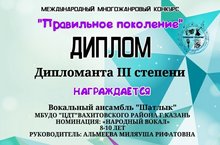 Поздравляем ансамбль вокальной студии "Шатлык" (руководитель Миляуша Рифатовна Альмеева) с получением диплома дипломанта III степени международного многожанрового конкурса "Правильное поколение"!