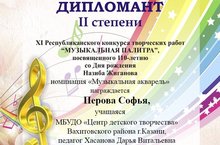 Поздравляем Перову Софью, учащуюся студии "Радуга" (руководитель Дарья Витальевна Хасанова) с получением диплома 2 степени в номинации "Музыкальная акварель" XI республиканского конкурса творческих работ "Музыкальная палитра", посвященного 110-летию со дня рождения Назиба Жиганова. Желаем дальнейших творческих побед!