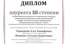 Поздравляем педагога дополнительного образования Алсу Ханифовну Тарвердян и заведующего отделом Татьяну Борисовну Шашину с победой в Всероссийском открытом творческом конкурсе работников образовательных организаций в сфере дополнительного образования "Педагогическая планета - 2021"!