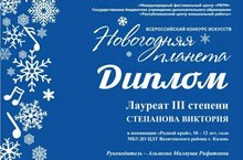 Поздравляем учащуюся вокальной студии "Шатлык" Степанову Викторию и ее руководителя Миляушу Рифатовну Альмееву с получением диплома лауреата III степени всероссийского конкурса искусств "Новогодняя планета"!