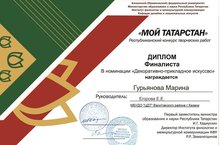 Подведены итоги республиканского конкурса творческих работ "Мой Татарстан". Гурьянова Марина и Гурьянова Снежана, учащиеся студии "Завиток" (руководитель Елена Евгеньевна Егорова) были награждены дипломами Финалистов в номинации "Декоративно-прикладное искусство".