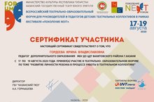 Педагог Центра детского творчества, руководитель театра эстрады, сатиры и юмора "ЕрашОК" Гордеева Ирина Владиславовна приняла участие во всероссийском театрально-образовательном форуме по теме: "Развитие личности ребенка в процессе работы в театральном коллективе"