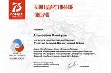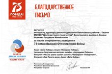 Общественная организация "Российское движение школьников" выразила благодарность методисту Центра детского творчества, куратору детского движения Вахитовского района Людмиле Михайловне Фоменко за активное участие в мероприятиях, посвященных 75-летию Победы в Великой Отечественной войне.