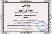 Педагог ЦДТ Танзиля Наилевна Гарипова приняла участие в вебинаре на тему "Специфика преподавания музыкальных дисциплин в онлайн" 11.05.2020