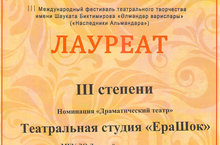 Поздравляем учащихся театральной студии "ЕраШок" (педагог Гордеева И.В.) с победой в V Всероссийском фестивале детского и молодежного театрального мастерства "Другое измерение"!!! Ребята получили диплом III степени.