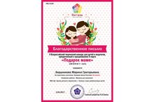 Поздравляем педагога дополнительного образования Бердникову М.Г., получившую благодарственное письмо за подготовку победителя во II Всероссийском творческом конкурсе для детей и педагогов приуроченный к празднованию 8 марта "Подарок маме".