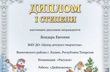 Поздравляем Бондарь Евгению с дипломом I степени, Давлетбавеву Регину с дипломом II степени, Даутова Тимерлана и Гузаирову Карину с дипломами III степени обучающихся студии «Волшебная кисточка» (педагог Фоменко А.Р.) с победой во Всероссийском творческом конкурсе "В мире сказок". Желаем стабильных результатов и дальнейших творческих побед! Молодцы!