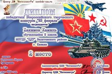 Поздравляем Хакимова Камиля (объединение «ИЗО», педагог Бердникова Марина Григорьевна) занявшего II место в Всероссийском творческом конкурсе «23 февраля».