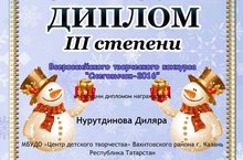 Поздравляем Нурутдинову Диляру (объединение "Аппликация", педагог Байрамова Галина Генадьевна) с победой во Всероссийском творческом конкурсе "Снеговичок - 2016". Диляра стала обладателем диплома III степени.