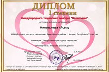 Поздравляем Миневалиеву Айсылу (студия "Валяшка", педагог Хисамова Д.Ю.), получившую диплом I степени , Валеева Тимура и Каллаура Алексея (студия "Эврика", педагог Киселев Г.И.), получивших диплом II степени и диплом I степени в Международном творческом конкурсе "Валентинка".