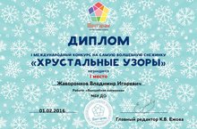 Поздравляем Жаворонкова Владимира, обучающегося объединения «Дошкольное образование» (педагог Бердникова М.Г.), занявшего I место в I Международном конкурсе на самую волшебную снежинку «Хрустальные узоры».