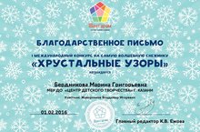 Поздравляем педагога дополнительного образования Бердникову М.Г., получившую благодарственное письмо за подготовку победителя в I Международном конкурсе на самую волшебную снежинку «Хрустальные узоры»
