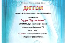 Вокльно-хоровая студия "Вдохновение" (педагог Курмашова Татьяна Николаевна) стала лауреатом 1 степени IX Городского экологического фестиваля "Солнечный мост".