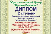 Педагог объединения «Волшебная кисточка» Фоменко А.Р. награждена дипломом 2 степени Всероссийского конкурса рисунков «Автомобиль будущего».