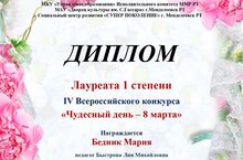 Поздравляем с победой в IV всероссийском конкурсе "Чудесный день - 8 марта!": учащихся студии "Радуга творчества" (педагог Быстрова Л.М.): Бедник Марию, Лукманову Амалию, Мухину Анастасию, Салахутдинову Амину! Учащихся студии "Палитра" (педагог Дьяконова И.С.): Хайдарову Азалию, Хайдарову Амалию, Яруллина Алана. И учащуюся студии "Мастерица" (педагог Ионова Е.В.) Мийзаеву Сумаю! Отличный результат! Так держать!
