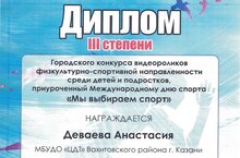 Поздравляем Анастасию Деваеву, учащуюся объединения "Карате" (педагог Елена Сергеевна Деваева), занявшую III место в городском конкурсе видеороликов физкультурно-спортивной направленности среди детей и подростков "Мы выбираем спорт"!