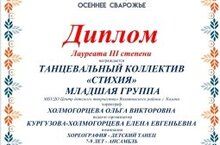 Поздравляем юных танцоров из младшей группы танцевального коллектива "Стихия" и их руководителя Ольгу Викторовну Холмогорцеву с удачным дебютом на международном конкурсе "Осеннее Сварожье", где ребята стали лауреатами III степени, а Ольга Викторовна получила благодарственное письмо оргкомитета конкурса за сохранение национальных культур и подготовку участников конкурса! Молодцы!