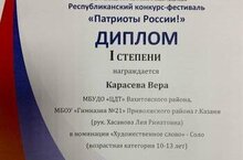 Поздравляем Карасёву Веру, учащуюся театра "Арт" (руководитель Лия Ринатовна Хасанова), с успешным выступлением на республиканском конкурсе-фестивале "Патриоты России!" Вера завоевала диплом I степени в номинации "Художественное слово" - соло, в возрастной группе 10-13 лет.
