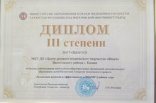 В рамках "Августовской конференции", наш Центр награжден Дипломом III степени по итогам рейтингования деятельности образовательных организаций дополнительного образования детей Республики Татарстан техничекого профиля, в номинации "За высокое качество и эффективность в 2016/2017 учебном году"