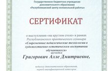 4 апреля в Республиканском центре внешкольной работы прошел Республиканский практический семинар " Современные педагогические технологии в художественно-эстетическом воспитании обучающихся", в котором приняла участие и выступила с докладом наш педагог Григорович Алла Дмитриевна. Она была отмечена сертификатом о выступлении "на круглом столе".