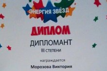 Учащаяся фортепианного отделения Морозова Витория (рук. Кузнецова О.Б.) получила диплом III степени на Всероссийском многожанровом конкурсе-фестиваля детского и юношеского творчества "Энергия звезд". Плздравляем и желаем дальнейщих успехов!