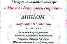 Поздравляем победителей Межрегионального конкурса "Мы все- дети своей страны" в номинации "Проекты", преподавателей А.М. Билалову, Е.Н. Молькову, Э.Ю. Хафизову, А.М. Шаймухаметову. Их социальный проект "Организация фестиваля "Дружба народов" для детей разных народов, обучающихся в ДМШ и ДШИ" стал обладателем звания Лауреата III степени! Желаем дальнейших побед и творческих успехов!