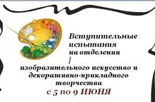 Вступительные испытания на отделении ИЗО и декоративно-прикладного творчества будут проходить с 5 по 9 июня 2017г. Для абитуриентов с 7 до 9 лет: творческое задание и собеседование. Иметь бумагу формата А3, цветные карандаши или мелки, простой карандаш, ластик. Время: с 16.00 – 19.00. Для абитуриентов с 10 до 13 лет – 2 экзамена: задание по рисунку (постановка с натуры) и творческое задание по композиции.Иметь бумагу формата А3 (2 листа), простой карандаш, ластик, акварельные краски, кисти. Начало экзаменов в 16.00. Всем абитуриентам необходимо принести домашние работы.