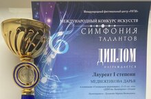 Медвеженкова Дарья, учащаяся музыкального отделения класса Ермаковой М.В., стала лауреатом I степени на Международном конкурсе искусств «Симфония талантов»!