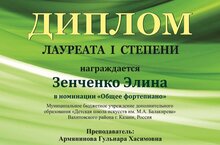 Учащаяся ДШИ им.М.А.Балакирева Зенченко Элина (преподаватель Армянинова Гульнара Хасимовна) стала лауреатом I степени на международном конкурсе «Музыкальная палитра» в номинации «Общее фортепиано»!