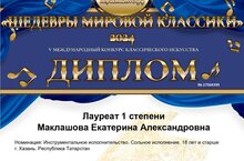 Преподаватель ДШИ им. М.А.Балакирева Маклашова Екатерина Александровна стала лауреатом I степени на V Международном конкурсе классического искусства "Шедевры мировой классики" в номинации "Инструментальное исполнительство. Сольное исполнение".
