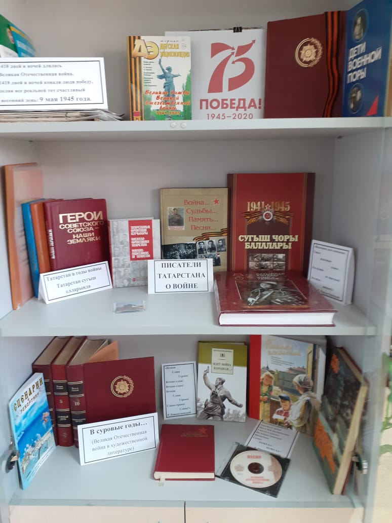 В течение учебного года в помещении школьной библиотеки действует книжная выставка под названием «75 лет Победе! (1945-2020гг.)», автором которой является сотрудник Е.А. Шашокина.