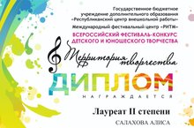 21 марта 2020 года в г.Зеленодольск в заочной форме состоялся Всероссийский фестиваль-конкурс детского и юношеского творчества «Территория творчества», в котором приняли участие видеоролики выступлений учащихся и преподавателей нашей школы.По результатам конкурса:- в номинации «Общее фортепиано. 10 – 12 лет. Соло», Салахова Алиса (преподаватель – Закирова А.А.) – Лауреат II степени;- в номинации «Академический вокал. 7 – 9 лет. Соло», Фараджова Ариана (преподаватель – Арсентьева Е.В.) – Лауреат III степени;- в номинации «Общее фортепиано (С.Губайдуллина, «Заводная гармошка»). 7 – 9 лет. Соло», Фараджова Ариана (преподаватель – Валеева Р.Б.) – Дипломант I степени;- в номинации «Общее фортепиано (С.Губайдуллина, «Песня рыбака» из цикла «Музыкальные игрушки»). 7 – 9 лет. Соло», Фараджова Ариана (преподаватель – Валеева Р.Б.) – Дипломант I степени;- вокально-инструментальный ансамбль преподавателей ДМШ №7 им.З.В.Хабибуллина (Гайнетдинова Э.И., Закирова А.А., Зыкова С.Ю., Низамиева Н.Н., Сайфуллина А.Ф.) – Лауреат I степени.ПОЗДРАВЛЯЕМ НАШИХ ЛАУРЕАТОВ И ЖЕЛАЕМ ДАЛЬНЕЙШИХ ТВОРЧЕСКИХ УСПЕХОВ!!! -