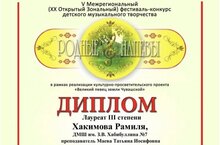 По результатам конкурса, в номинации «Инструментальное творчество. Соло. Фортепиано. Категория: 11 – 13 лет», учащаяся нашей школы, Хакимова Рамиля (преподаватель – Маева Т.И.) – Лауреат III степени.