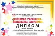 25 марта 2024 года в г.Зеленодольск в МБУДО «Детская школа искусств г.Зеленодольска Республики Татарстан» под эгидой Управления культуры Исполнительного комитета Зеленодольского муниципального района Республики Татарстан состоялся II Открытый межрегиональный конкурс исполнителей «Звёздная гармония – Йолдызлык гармония», в котором приняли участие учащиеся фольклорного отделения нашей школы (преподаватель – Низамиева Н.Н., концертмейстер – Романова И.П.).