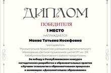 По итогам конкурса, в номинации «Дополнительное образование», преподаватель нашей школы, Маева Т.И. заняла I место с творческой работой «Формирование личности школьника средствами приобщения к произведениям народного творчества».