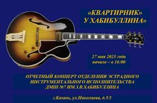 27 мая 2023 года в ДМШ №7 им.З.В.Хабибуллина состоялся отчётный концерт «Квартирник» у Хабибуллина»: «КИНОМУЗЫКА», в котором приняли участие учащиеся отделения эстрадного инструментального исполнительства (преподаватели – Хабибулин Р.Н., Закиров А.А., Галимуллин Р.И.) и художественного отделения нашей школы (преподаватель – Габитова Р.А.).