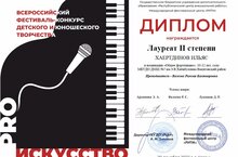 - в номинации «Общее фортепиано». 10 – 12 лет. Соло», Хаертдинов Ильяс – Лауреат II степени;