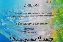 - в номинации «Инструментальное исполнительство. Соло. Вторая средняя группа (12 – 14 лет), Насыбуллин Дамир (преподаватель – Романова И.П.) – Лауреат III степени.