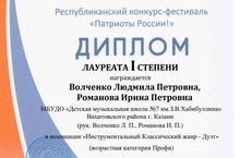 По результатам конкурса, в номинации «Народные инструменты», 10 – 12 лет, соло», учащаяся нашей школы, Узбекова Сабина (преподаватель – Зыкова С.Ю., концертмейстер – Романова И.П.) – Лауреат III степени.