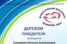 С 18 октября по 20 ноября 2021 года в Москве и Московской области в онлайн-формате проходил Всероссийский Фестиваль педагогических идей и профессионального мастерства «Открытие – 2021», в котором приняли участие и были награждены Дипломами победителя преподаватели нашей школы: Низамиева Н.Н., Перетягина И.Ф., Петров В.А., Романова И.П., Столярова Н.А. и Ткач И.И.
