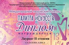 25 мая 2021 года в Казани под эгидой Международного фестивального центра «РИТМ» и ГБУДО «Республиканский центр внешкольной работы» состоялся Международный творческий конкурс «Палитра искусств», в котором приняли участие учащиеся и преподаватели нашей школы.