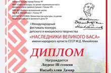 - в номинации «Эстрадный вокал. Средняя группа», Насыбуллин Дамир – Лауреат III степени.