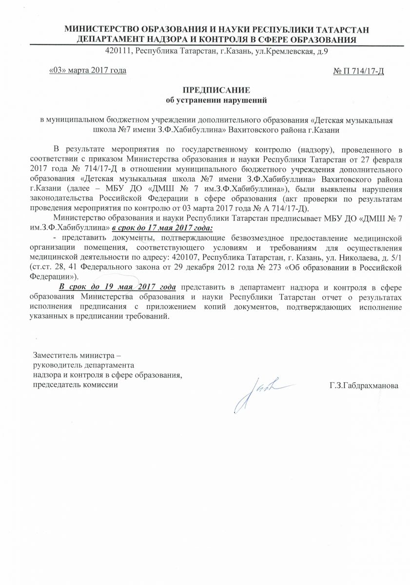 Предписание об устранении нарушений № П 714/17-Д от 03.03.2017 г.